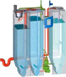 - Cámaras de reciclado principal y previo, en donde los bio-cultivos desmenuzan la suciedad del agua. Cada tres horas el agua vuelve a ser bombeada.